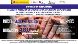 El próximo 2 de marzo de 2026 comenzará en Segovia el curso presencial de “Atención Sociosanitaria a Personas Dependientes en Instituciones Sociales”, con una duración de 480 horas, que permite obtener un Certificado de Profesionalidad completo (Grado C – Nivel 2).